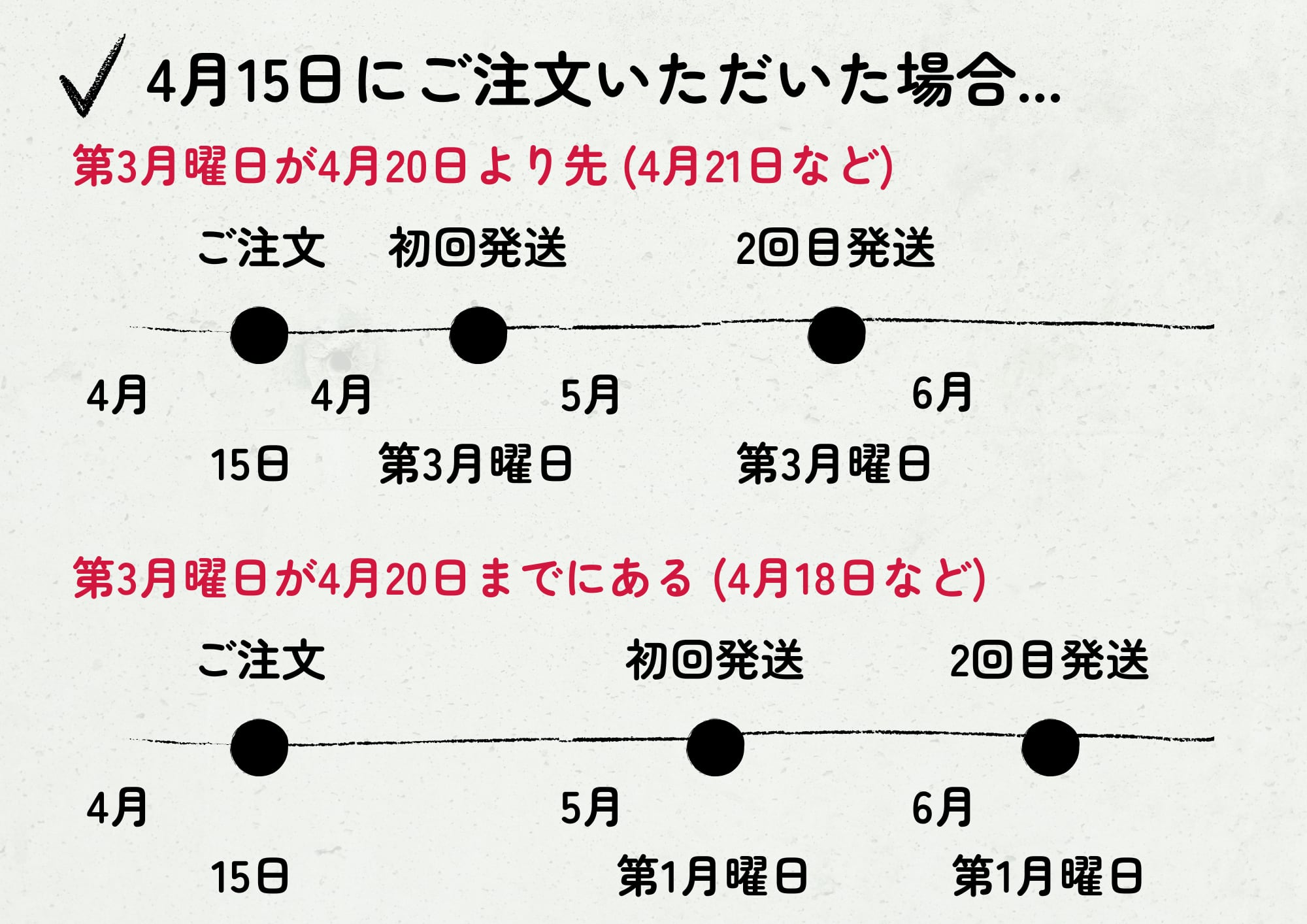 定期便をご注文の方は、初回のご注文をいただいた翌日から5日後より先の、1番最初の第1月曜日または第3月曜日が初回発送日となります。
