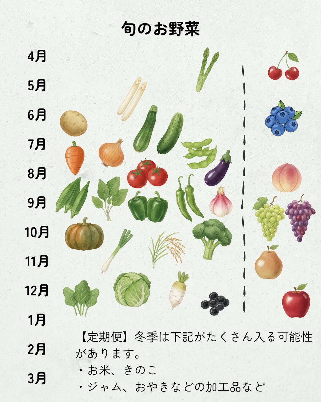 旬の野菜、果物を詰め込んで月1回ご自宅にお届けする、野菜ボックスの定期便です。